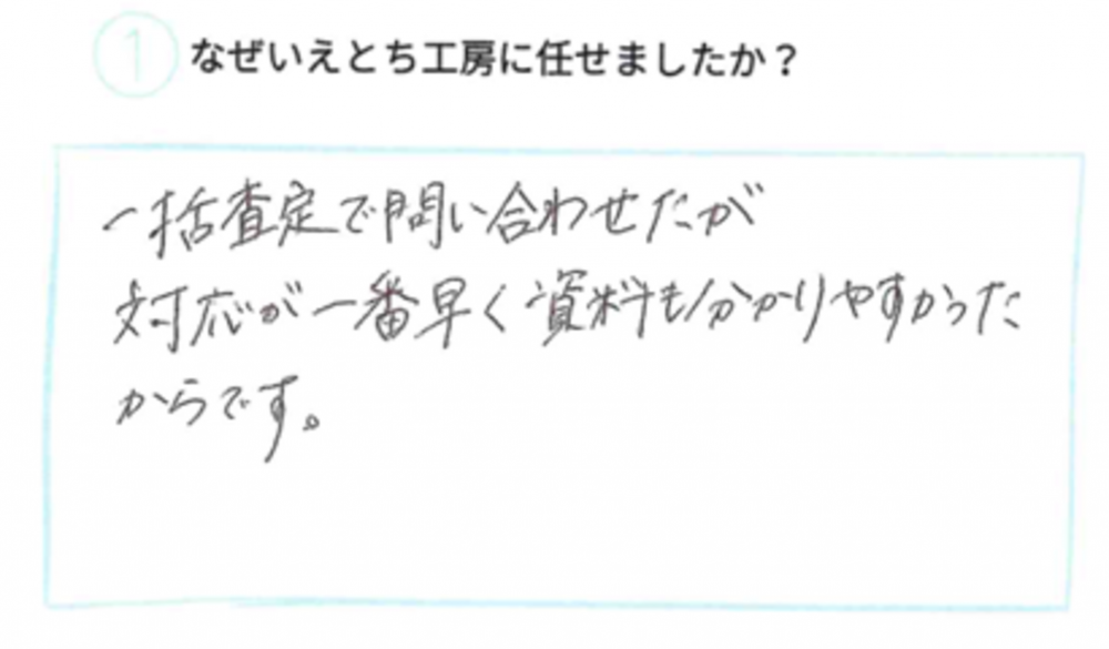 一括査定で問い合わせたが対応が一番早く資料も分かりやすかったからです。